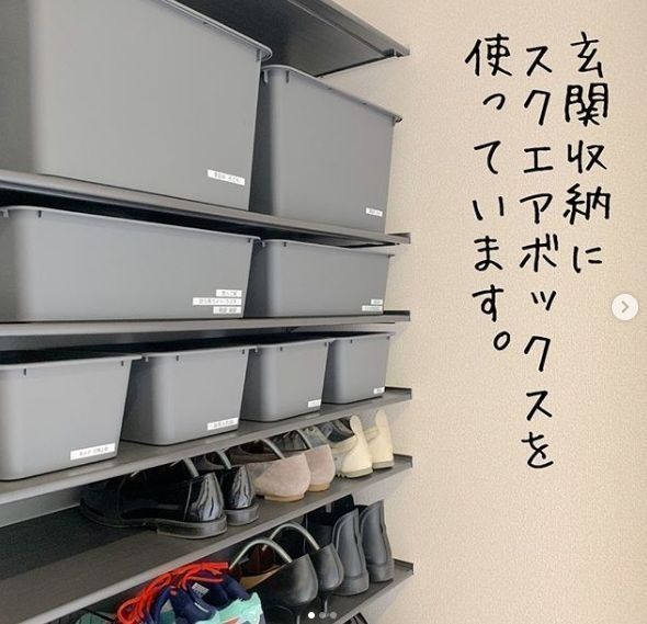 玄関の収納も100均の収納ボックスを活用している例です。玄関も細かい物が多いので、ボックスにひとまとめにしておくと便利ですよね。カラーは少し暗めのグレーの方が玄関にマッチします。普段使わないレジャーシートやスリッパ、子どもの外遊び用のおもちゃなどもここに入れておけば使う時にすぐに取り出すことができますね。