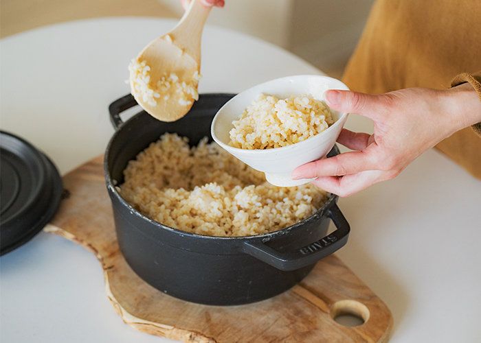 玄米を鉄鍋で炊いているという嵐田さん。「ちょっとクセのある玄米も、クリクラの水を使うと雑味がなくふっくらおいしく炊き上がります。途中で差し水をする“びっくり炊き”ならスピーディー!おいしく栄養を補給できます」