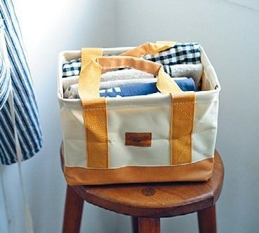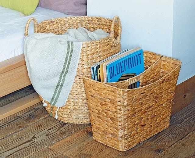 ナチュラルな天然素材のバスケットもリーズナブルに手に入り、インテリアとしても素敵。大きめサイズの割に軽いので、かさばる物の収納にぴったり。開口部が広く、投げ込み式で片づけられるのでラク!