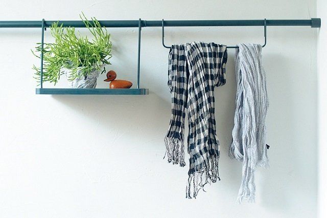 つっぱりポールに引っ掛けて使う斬新なアイテム。収納を増やせるトレーやタオル掛けは、シックな色合いも魅力です。玄関に設置してグリーンを置いたり、ストールを掛けて見せる収納にしてもセンスよし。