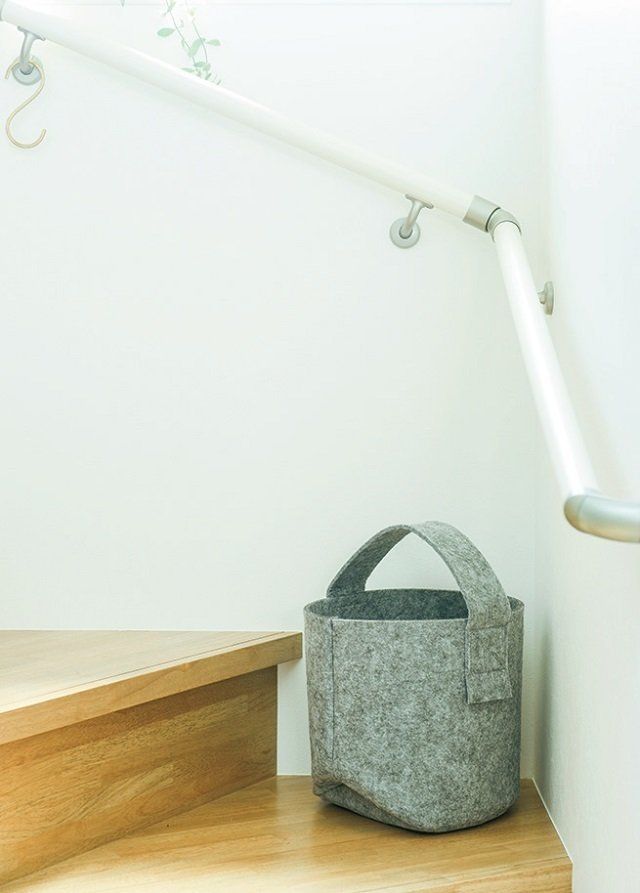 リビングに置きっ放しの私物は、気づいた時点で階段下のバッグへ入れることに。上の階に上がるときに自然と目につく場所なので、戻し忘れがなくなり、運ぶのもラク。