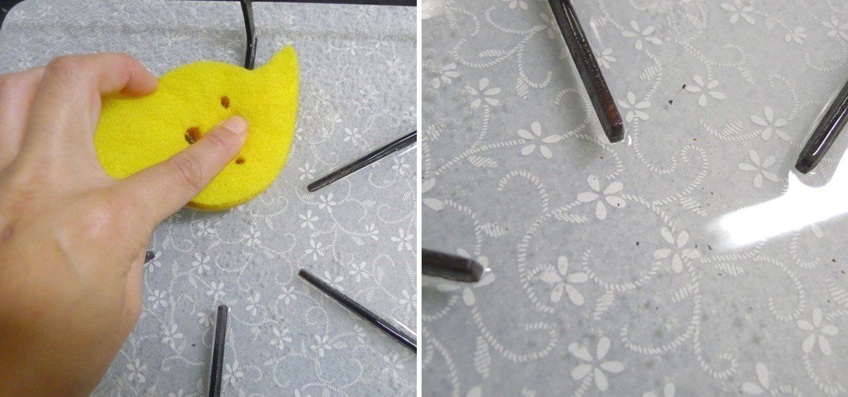 5分程度置いたら、器から引き揚げて、残った汚れをスポンジや使い古しなどで落としましょう。