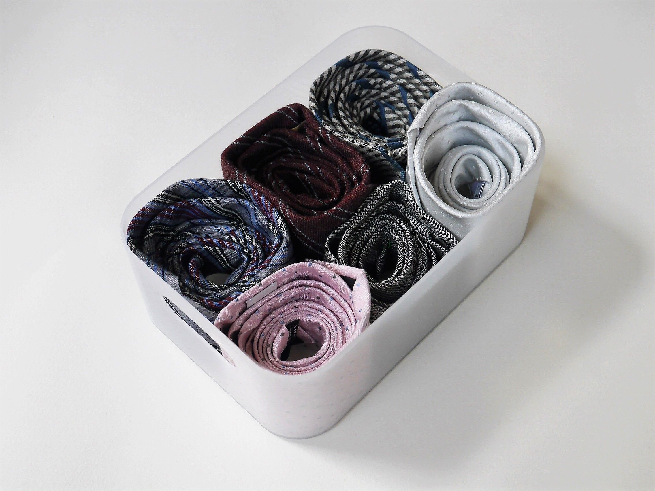 100円ショップなどで手に入るプラスチック製の収納ボックス。ネクタイを巻いて入れると、複数本をまとめて収納可能。見た目も美しく、アイテムがひと目で把握できます。