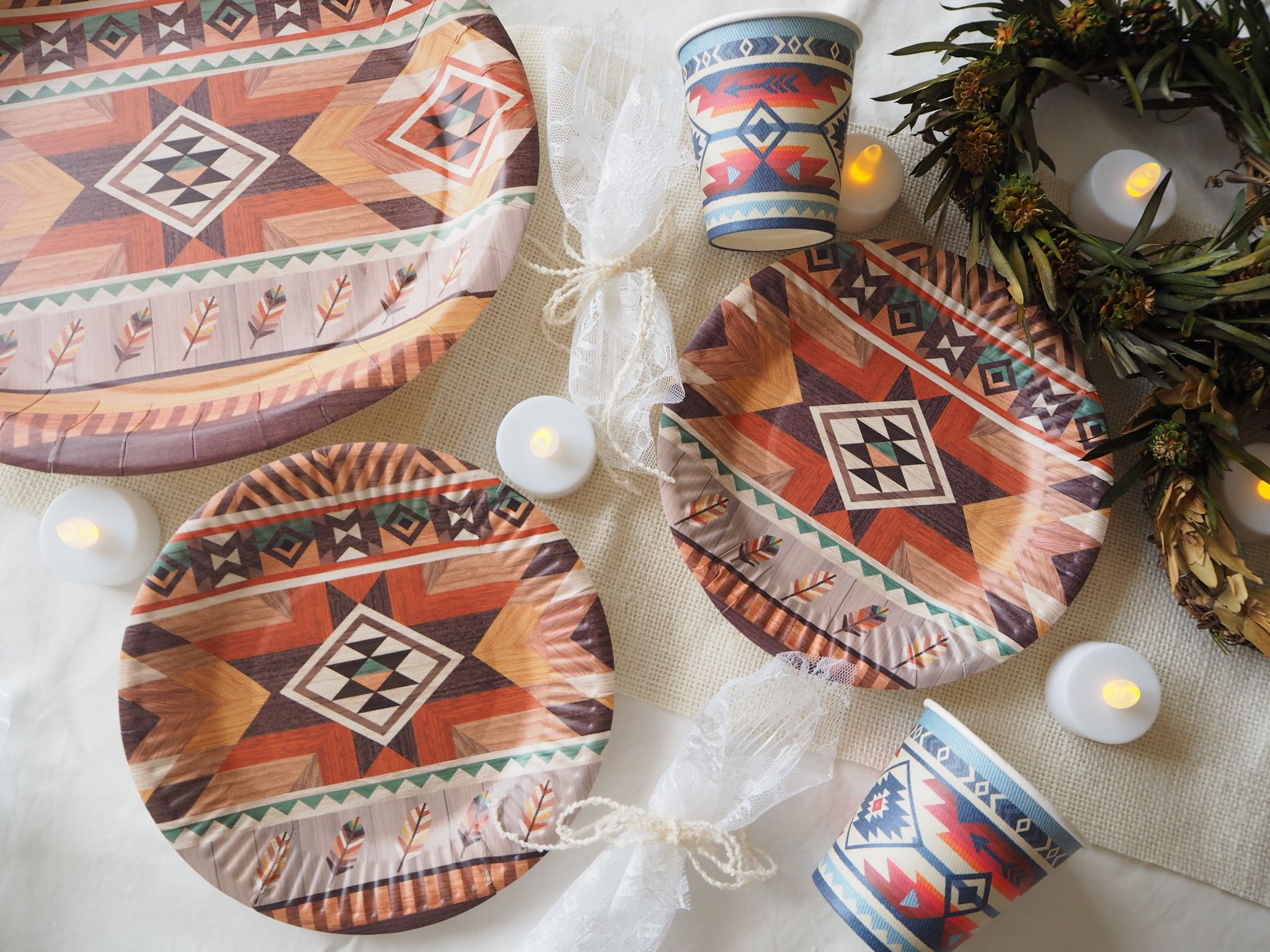 いろんな形のお皿と紙コップのデザインが統一されてるので組み合わせのしやすいネイティブ柄シリーズ。