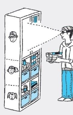そこで、見やすい高さといわれている〝アイポイント(=目線)〞に合わせて、上下10~15㎝の範囲に収納をつくれば、ストレスなく片づけられます。