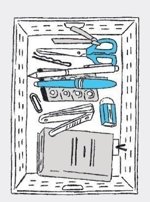 そこで、リビングなどの共有スペースに置かれがちなもの(はさみ、爪切り、筆記用具など)は、1つのカゴにまとめて手の届きやすい場所に収納しましょう。物を取るためにわざわざ立ち上がったり、部屋を移動して取りに行く面倒がなくなるほか、戻すのもラク。