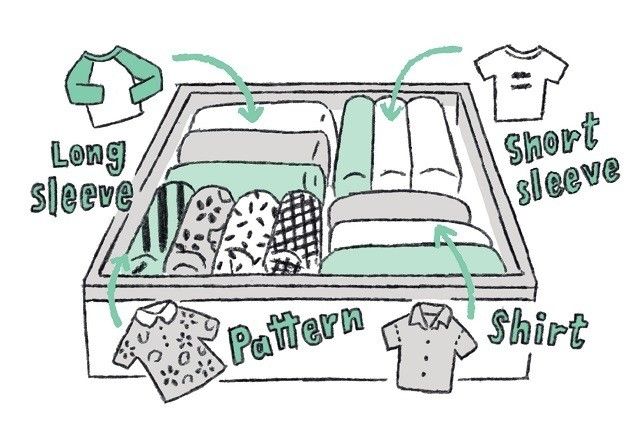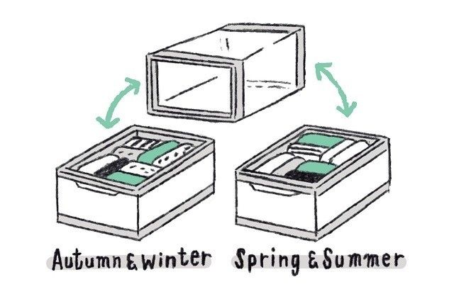 衣替えの際、オフシーズンの服を1つにまとめて収納してしまうと、来年出すときにひと苦労。でも、春夏用、秋冬用の洋服を同じ形の箱(収納ケースや引き出しでも可)に収納すれば入れ替えるだけで衣替えが完了します!