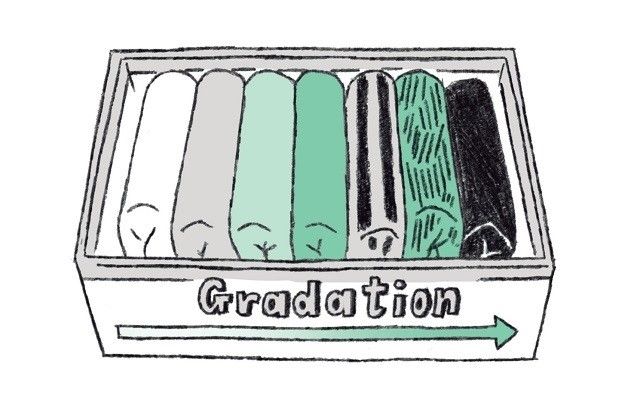 なんとなく空いているスペースに洋服を収納していくと、統一感のない収納になり、目当ての服を探すのが困難に。「左から右に、色の薄い順で並べる」と決めるだけで、見た目も整い、探すのもラクになります。