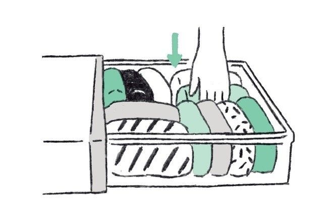 引き出しの服と服の間を、手のひらがスムーズに通るかチェック。入れにくかったり、出すときに服がくずれたら、量が多い証拠です。