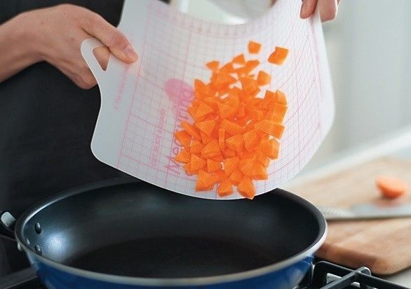 ■ころがりがちな食材は、曲がるまな板で一気に鍋へ