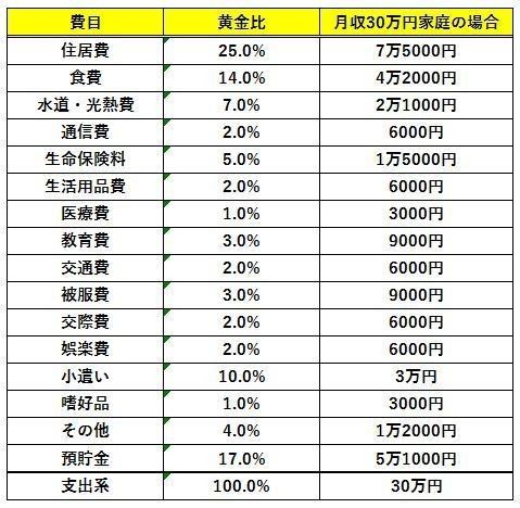 月収30万円の家庭を黄金比率に当てはめた「黄金家計」