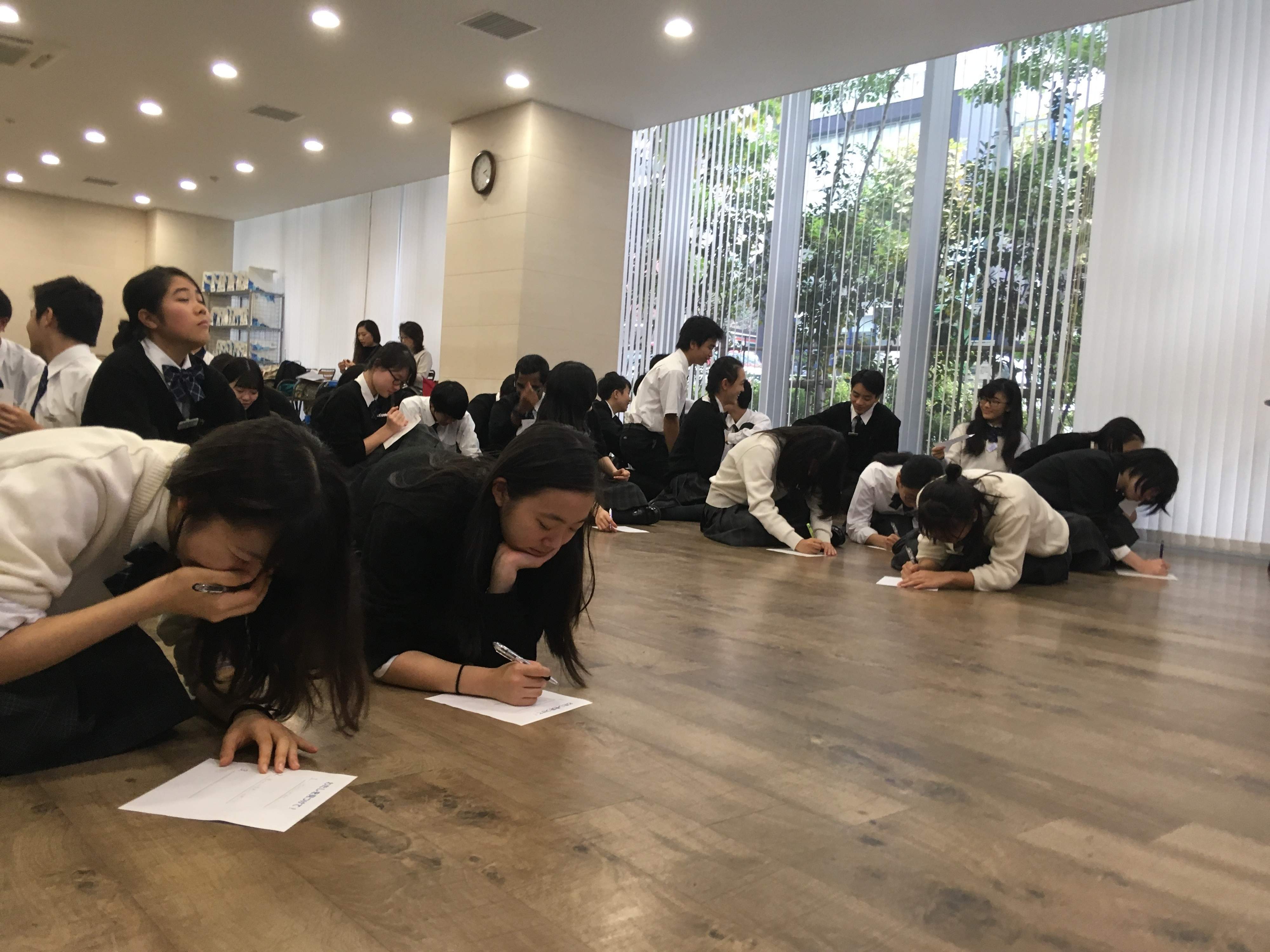 スタートの合図とともに、生徒たちは真剣そのもの。「自分の特徴を3つ書く」というお題は、簡単なようで実は日ごろあまり考えたことがないからか、「3つも書けない!」「自分の特徴ってなんだろう?」という声が飛び交います。