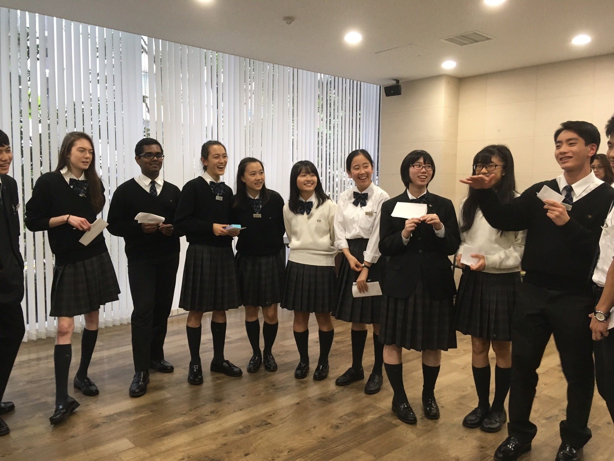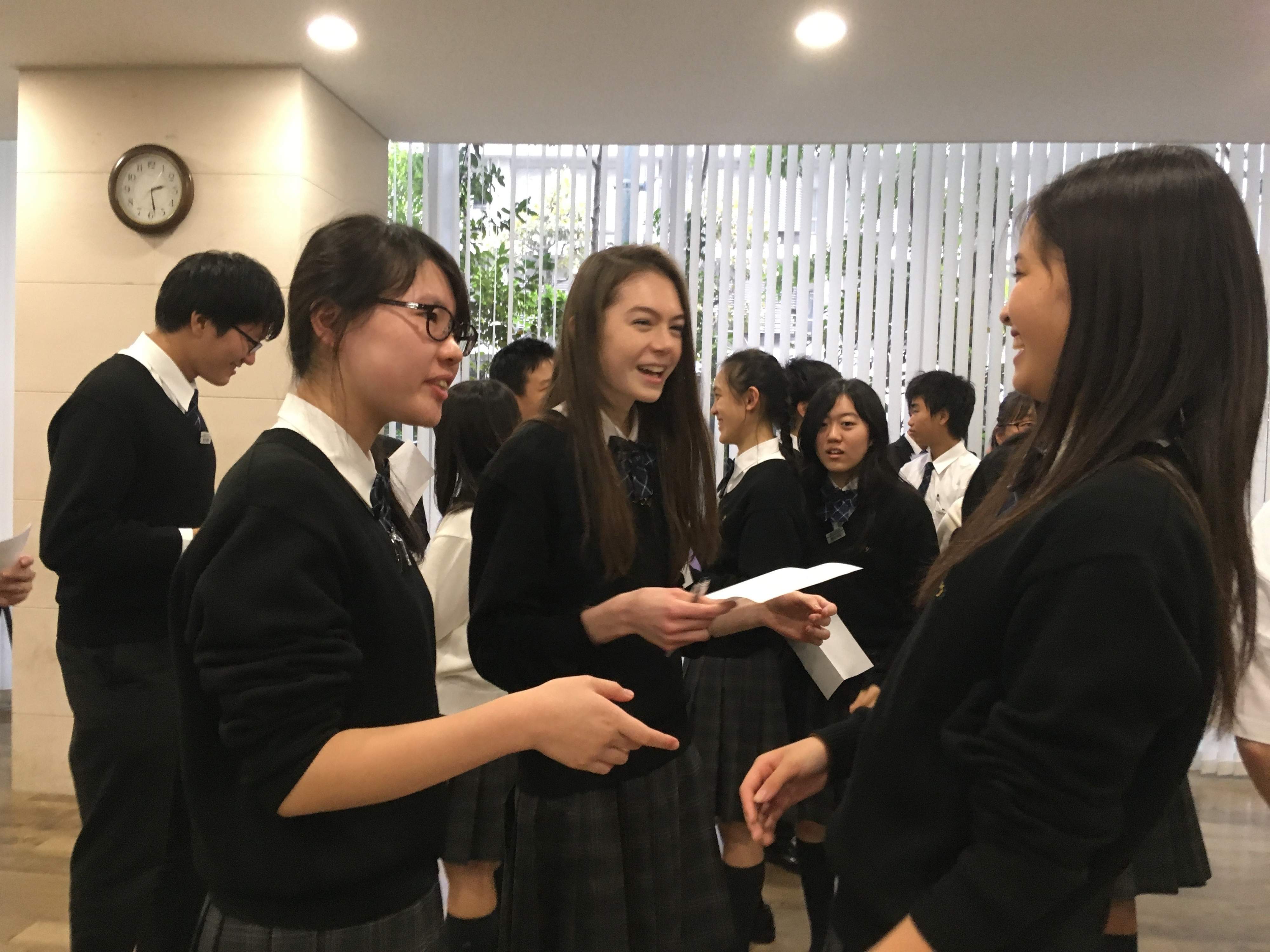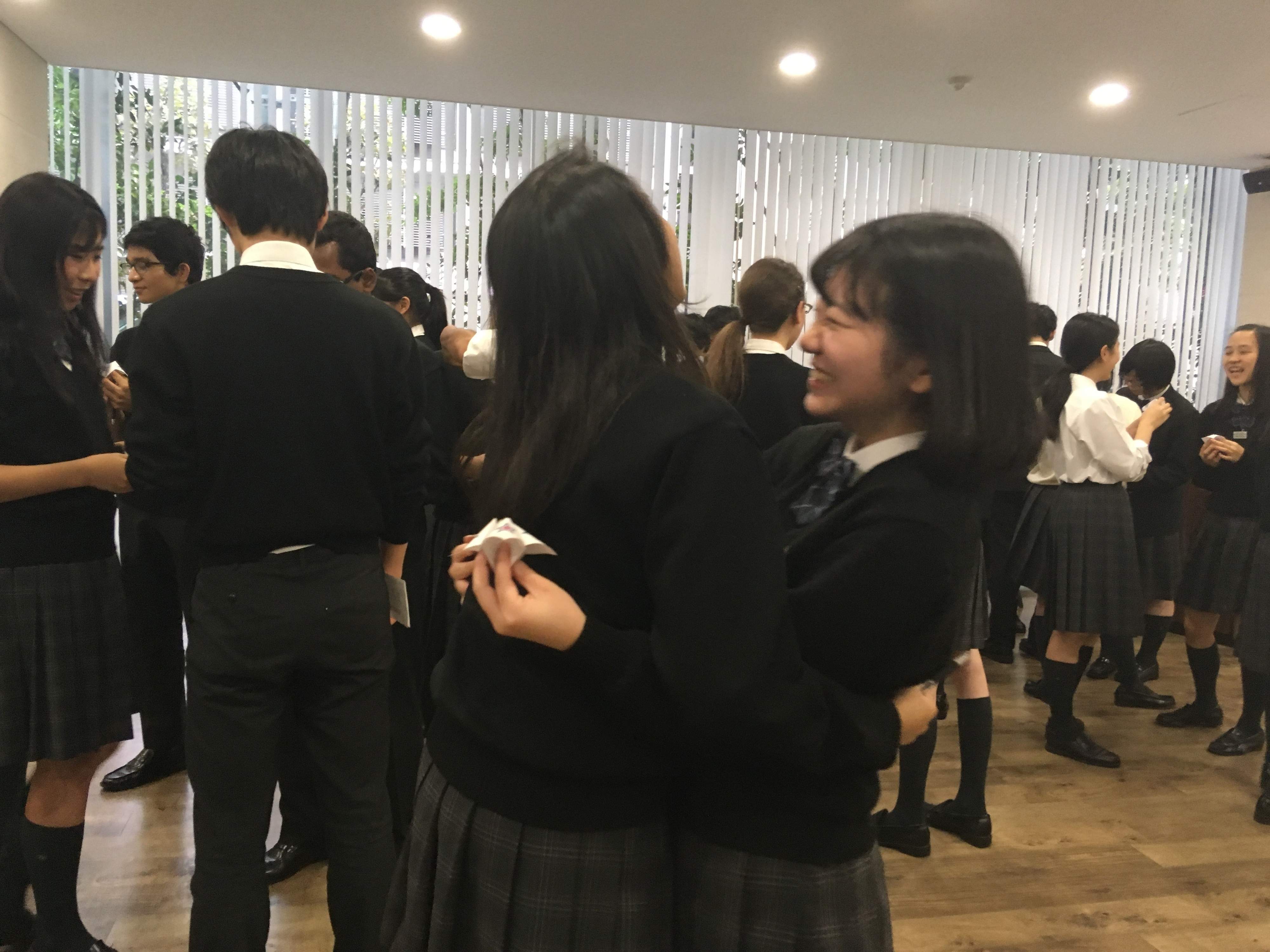書き終わったら、全員でシャッフルして捜索タイム。わいわいと盛り上がる中、無事に相手が見つかったら、自分が思うその人の印象をひとつ伝えるのがルールです。「いつも笑顔が印象的だよ」「髪の毛がとってもきれいって思ってた」「いろいろ気がついてやさしいよね」……など、容姿や内面も含め、なかなか聞く機会がない自分の印象を知ることができ、生徒たちからは自然と笑顔がこぼれます。