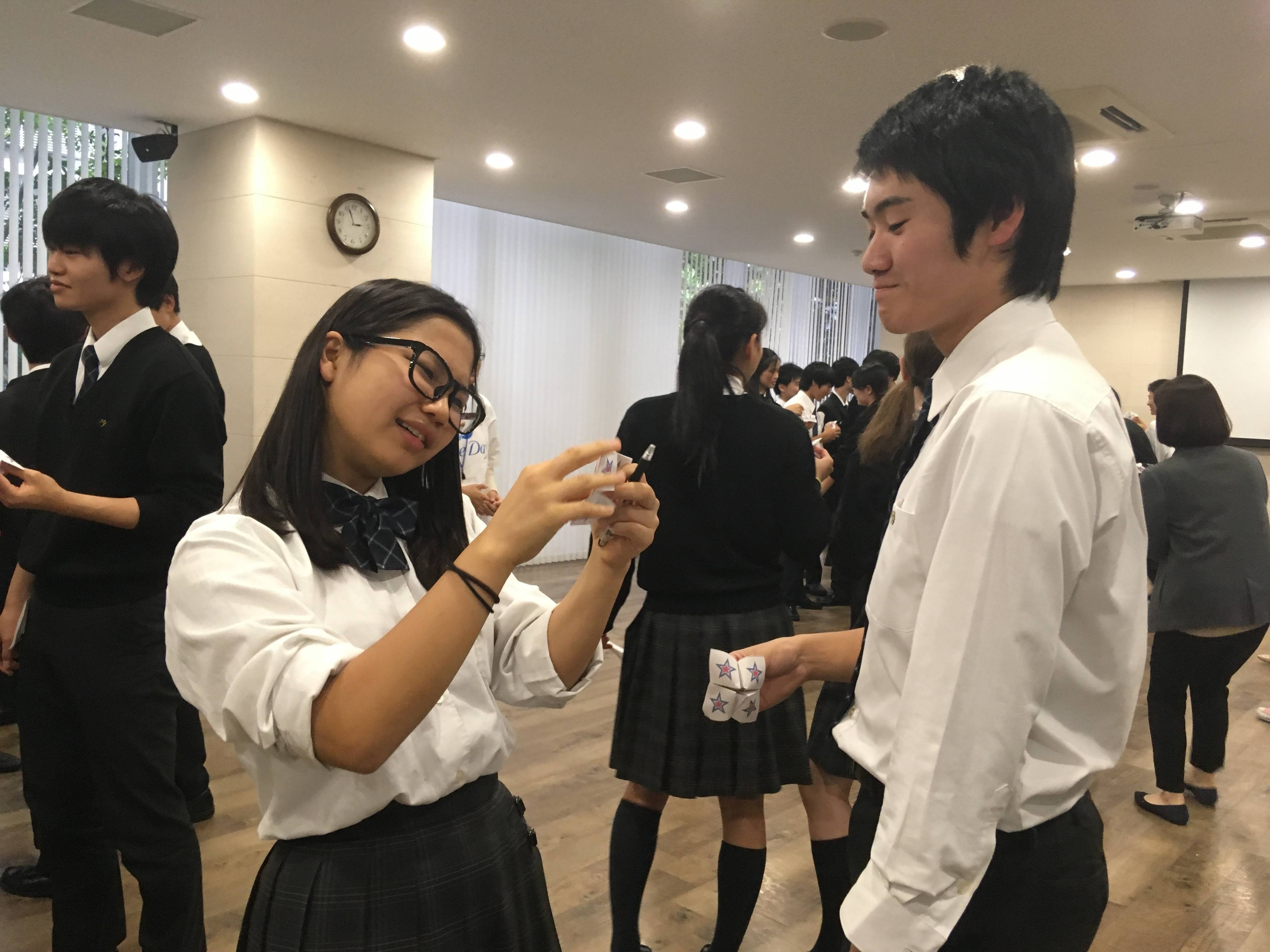 最後は、折り紙に容姿についても含めた「自分のいいところ8つ」を書いて、いろいろな人とセッションするプログラム。最初のプログラムと同様、「8つも書けない!」という声も聞こえつつ、だいぶ“自分自身を見つめるコツ”がつかめてきた様子。書き終わったら、一対一でいろんな人と発表しあい、お互いについて認め合います。会場はすっかり打ち解けた空気に包まれ、中には思わずハグし合う生徒も!