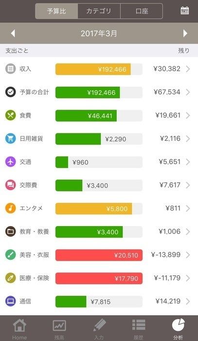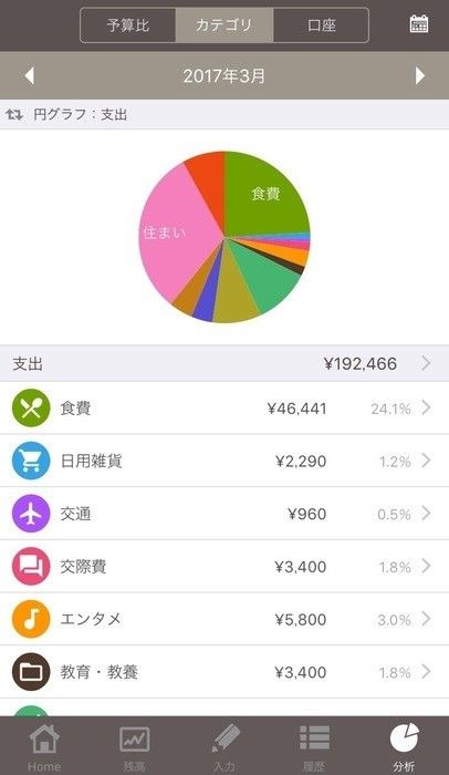 銀行、クレジットカード、電子マネーなどの情報を登録すると、残高や支出の情報を自動取得。レシートの自動読み取り機能のほか、現金収入・支出を手入力で記録することができ、家計簿が簡単に作成できます。「食費」「日用品費」「公共料金」などの項目が数多くあるので、細かく家計管理したい人におすすめ。