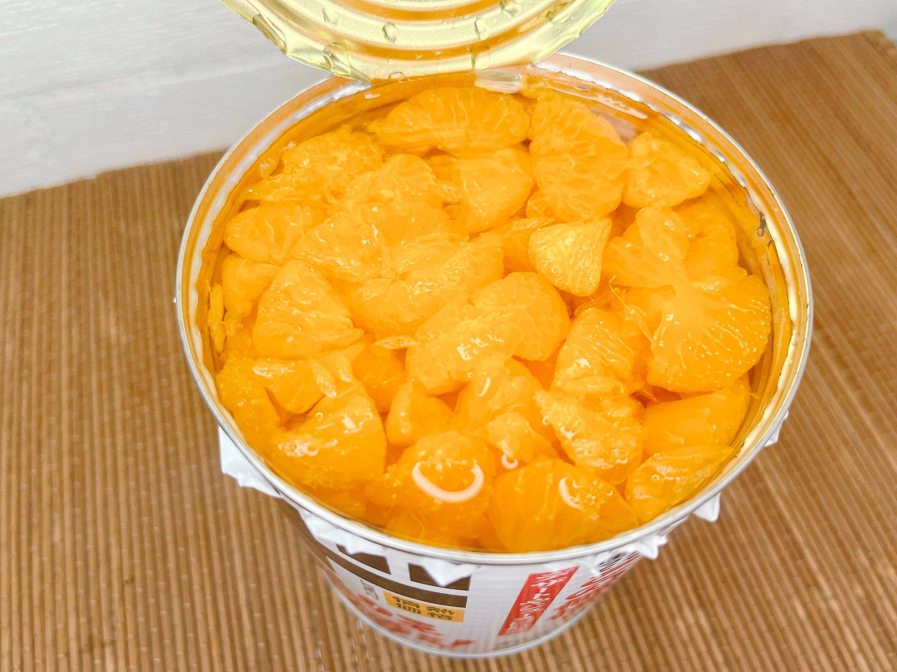 缶切りで蓋を開けるとぎっしり詰まったみかんがお目見え!