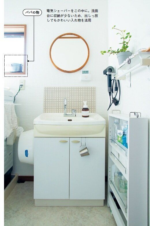 洗面台横のすき間を活用し、キャスター付きスリムワゴンを歯ブラシ置き場にしているのが斬新!家族みんなが手を伸ばさずとも取れるベスポジで。
