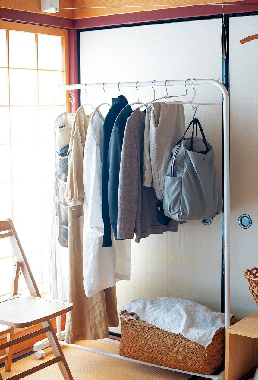 リュックは姉妹それぞれのケースへ!ハンガーに上着を掛けるのはハードルが高いのでカゴに入れるだけに。