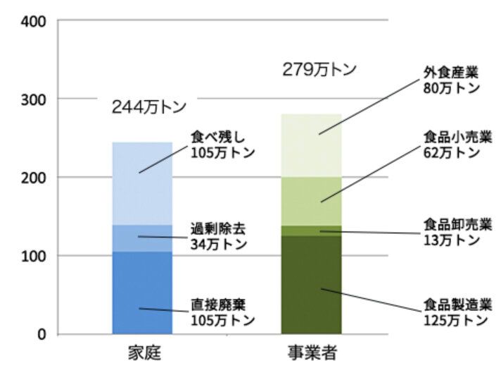 家庭の食品ロスの内容は、上のグラフのとおり「食べ残し」が105万トン、「直接廃棄」も105万トンで、「過剰除去」が残り34万トンです。