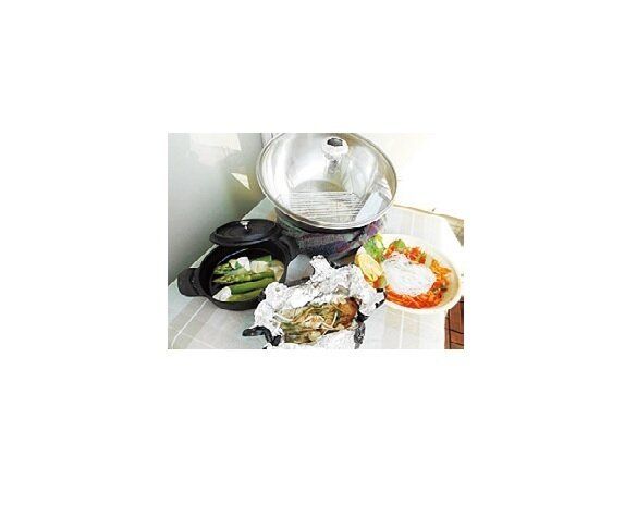黒い容器などに太陽光を効率良く集めて熱に変換し、材料を加熱するソーラークッカー。レジャーシートも活用でき、魚の切り身などが約2時間で蒸し焼きに。「黒く塗ったアルミホイルで冷めたご飯を包んで放置しておくと、ホカホカになりますよ」。