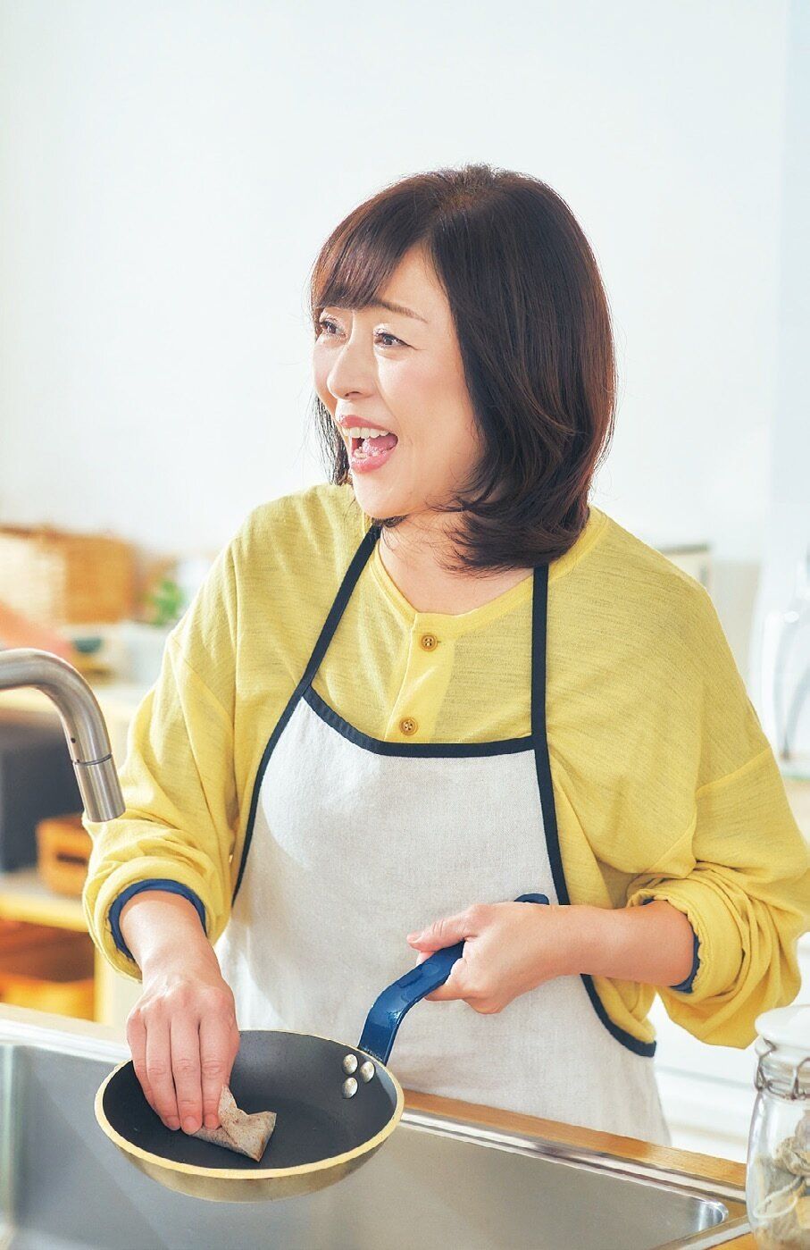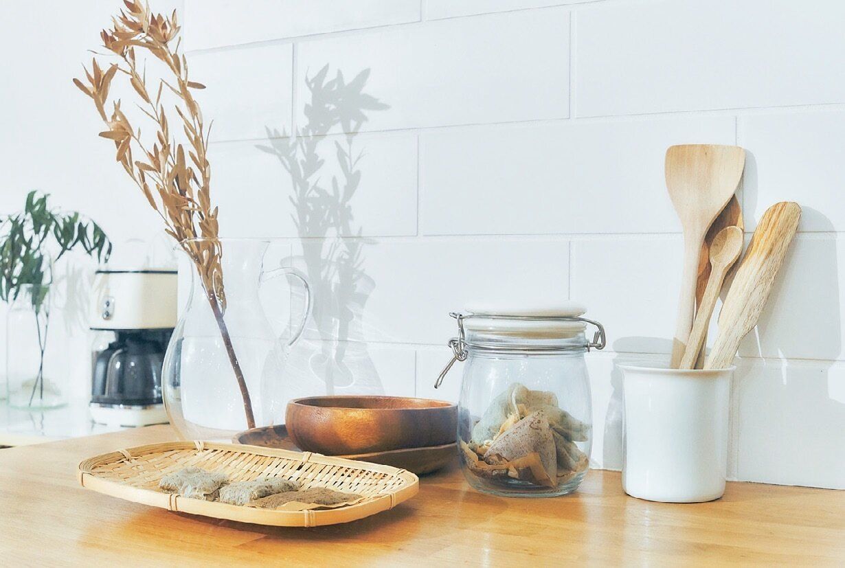 「フライパンや食器洗いに欠かせないのが、使用済みティーバッグと、着古したセーターをほどいて編んだアクリルたわし。どちらも油汚れをよく落とすので、洗剤を使う量が減らせるエコアイテムです!」。