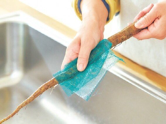 オクラが入っているネットは、編み目が粗くて硬いから、ごぼうやじゃがいもを洗うのにぴったり!たわし代わりになり、使ったらすぐに捨てられる気楽さも◎。