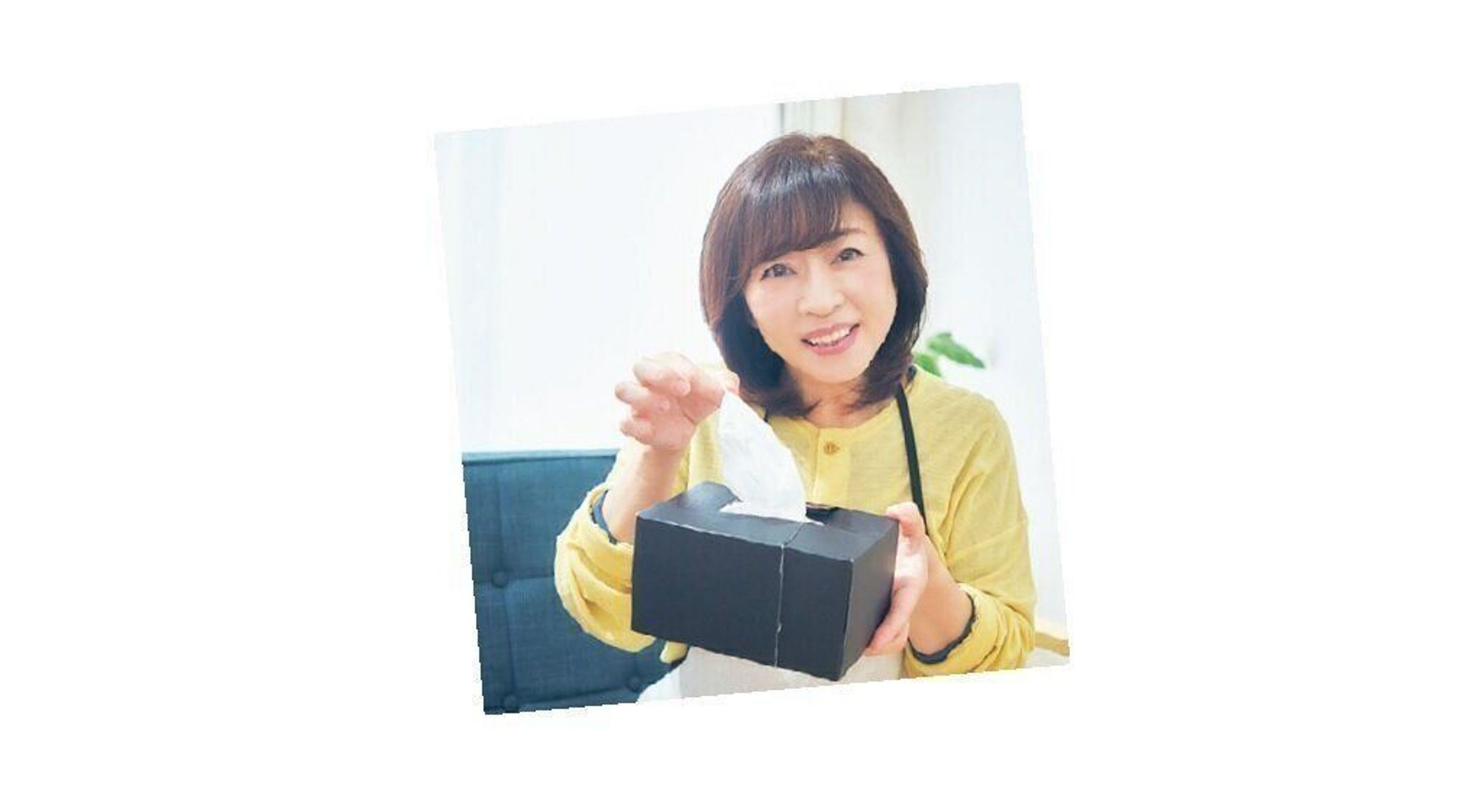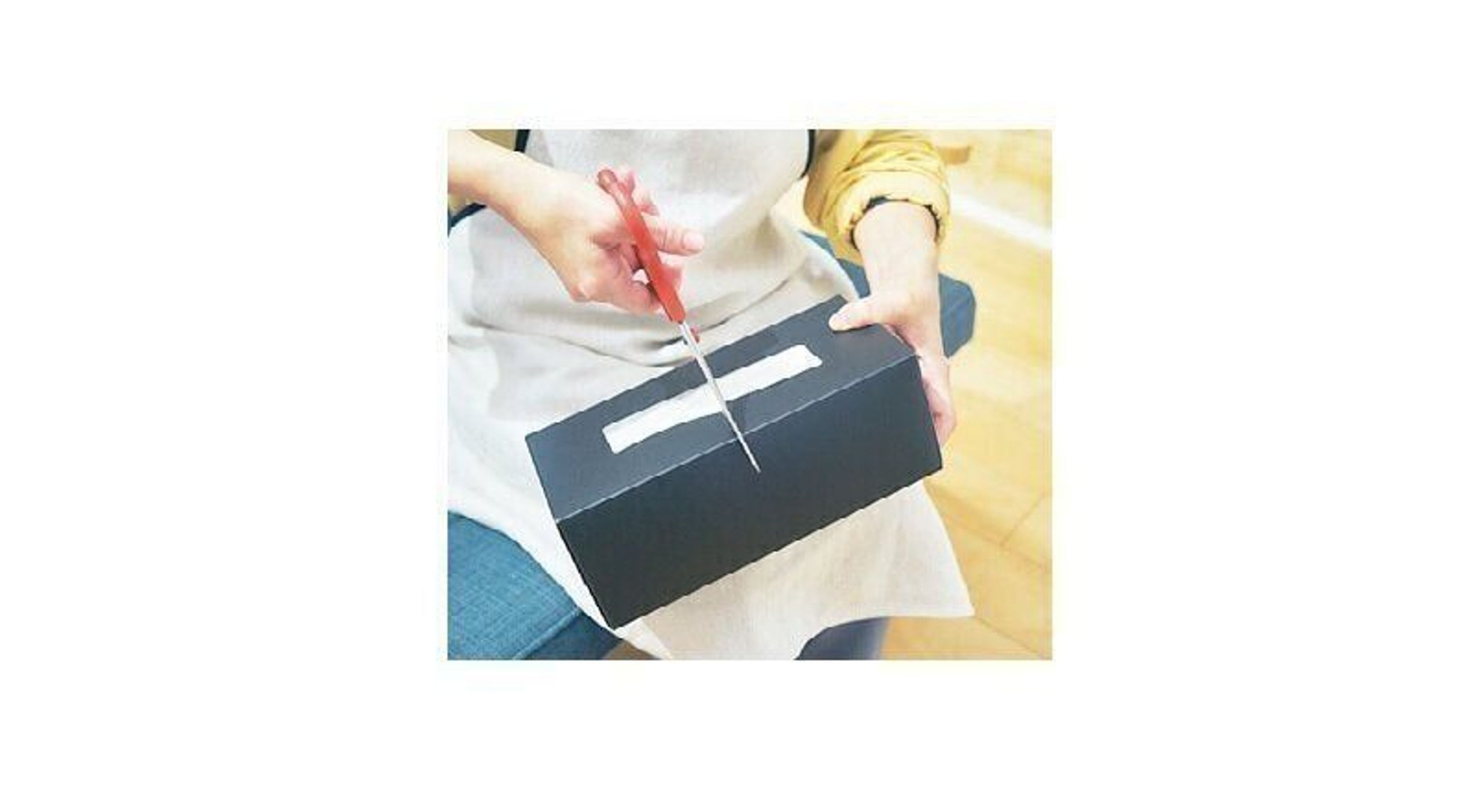 ボックスティッシュが倍になる、夢のようなアイデア。箱とティッシュを横半分に切り、ティッシュを片方の箱に入れ、もう片方の箱を合体。「ちょっと口を拭くときなんてこれで充分。かなりお得!」。