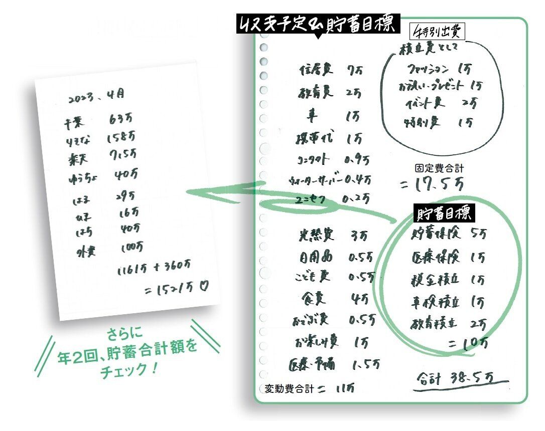 毎月の固定費の予算と一緒に貯蓄目標を書くことで、「この貯蓄を維持しよう」という意識が高まり、予算が守れるように。さらに、半年ごとに総貯蓄額をメモし、夫にもやりくりの成果を共有。いくら殖えたか目に見えてわかるとやりがいがあります。