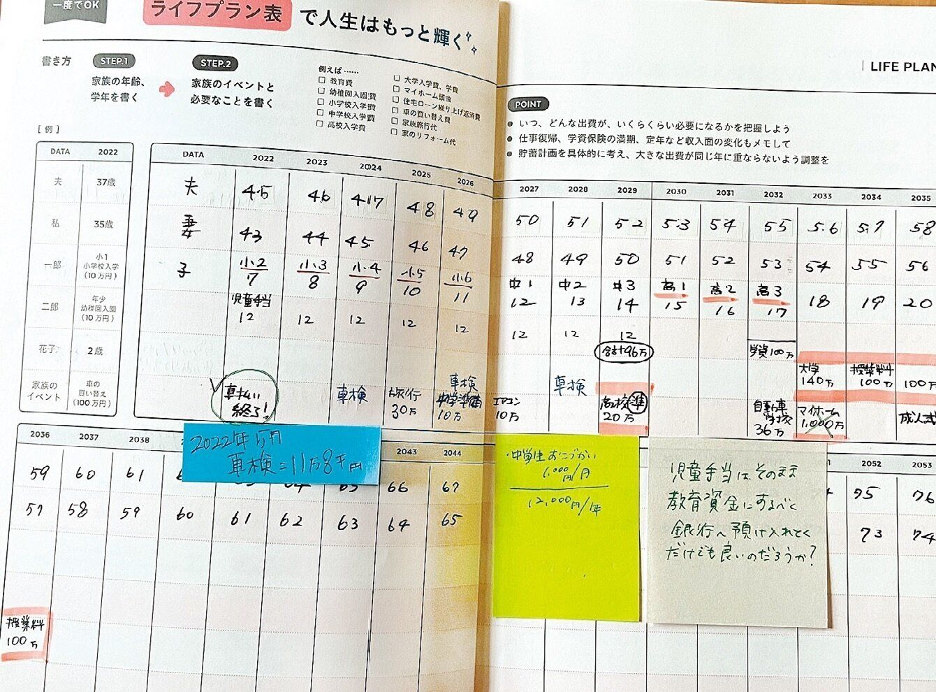 ライフプラン表は毎年更新。実際に支払った車検の金額を付箋に書き、2年ごとの予算を意識。また、教育費のプランで疑問を感じたことなどもメモして、検討するきっかけに。
