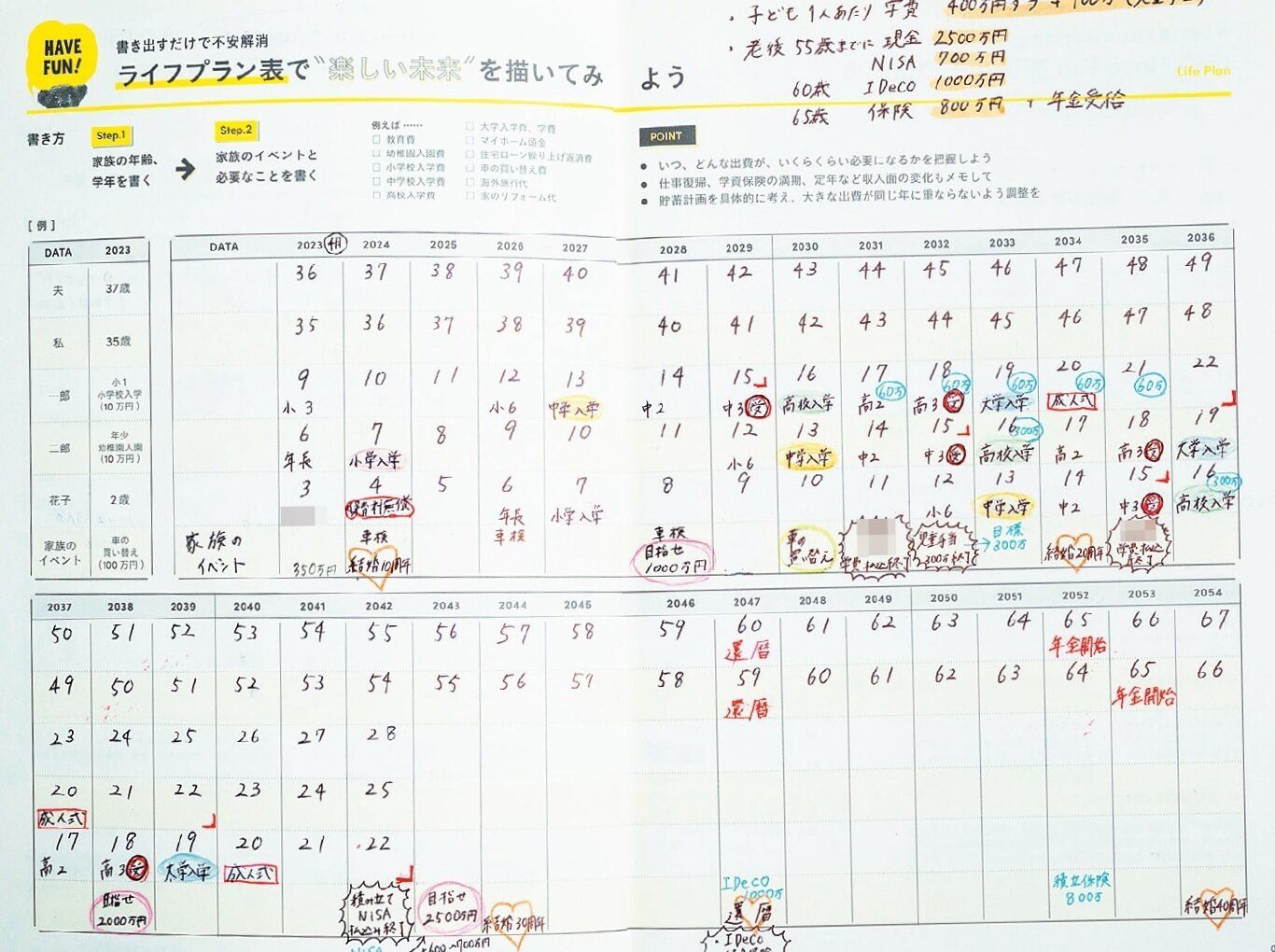 家計を見直し始めたころ、ファイナンシャル・プランナーの無料講演会に参加し、ライフプランの必要性を実感。「ライフプランを書いて先を見通したら、教育費のピークがひと目でわかり、貯めるべき目標がハッキリしました。貯蓄を安定させるため、特別出費の年間予定表を作成し、予算を先取り。また、今やりたいことや、自分を高めることを書くと、気持ちが落ち着き、ムダ買いが予防できました。