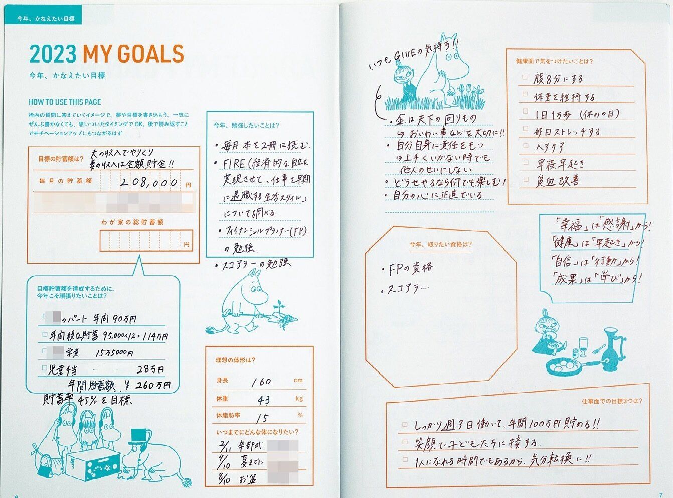 「今年かなえたい目標」や「欲しい物」を項目ごとに記入。「必要な予算」「いつまでにかなえたいか」を具体的に書くと、「実現させたい!」という気力が高まり、余計な支出を抑えられるように。