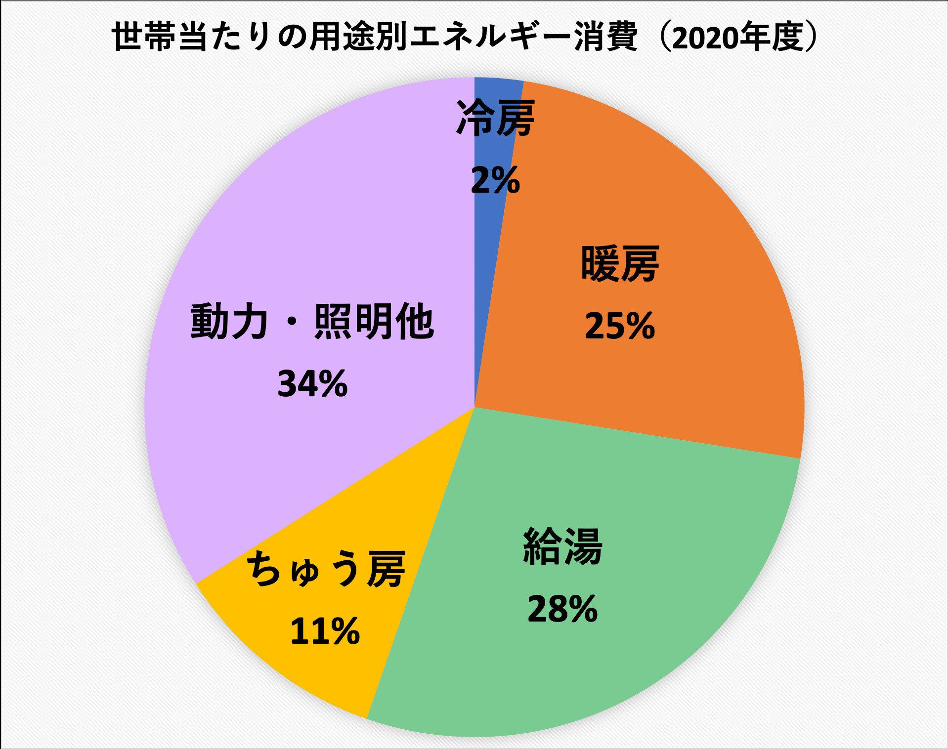 下のグラフは、家庭でのエネルギー消費の割合です。家庭で使うエネルギーを用途別に見ると、動力・照明他、給湯、暖房、厨房、冷房の順で使用量が多くなっています。