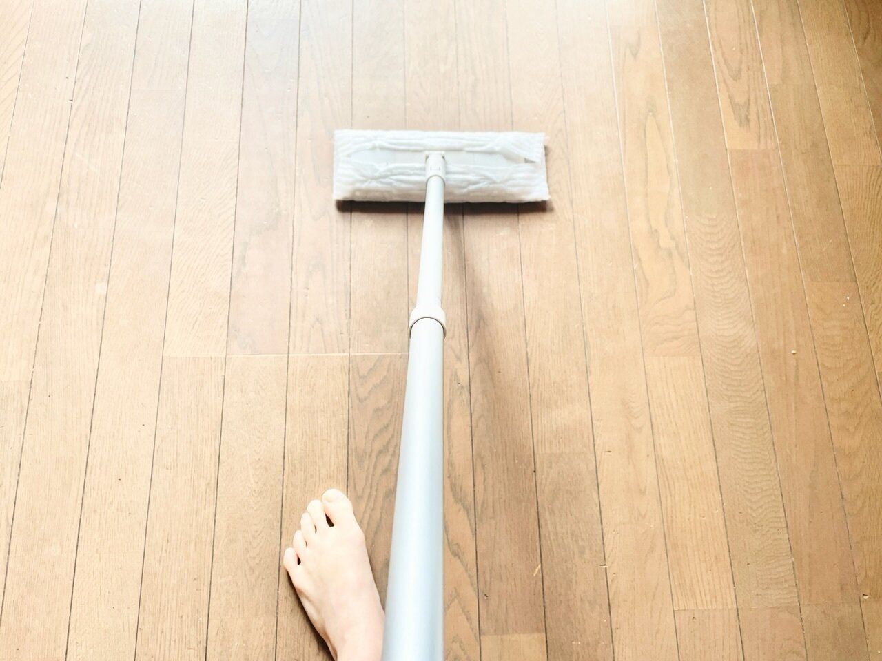 私は、朝起きてトイレに行くまでのついでにフローリングワイパーを持ってリビングと廊下を一周します。
