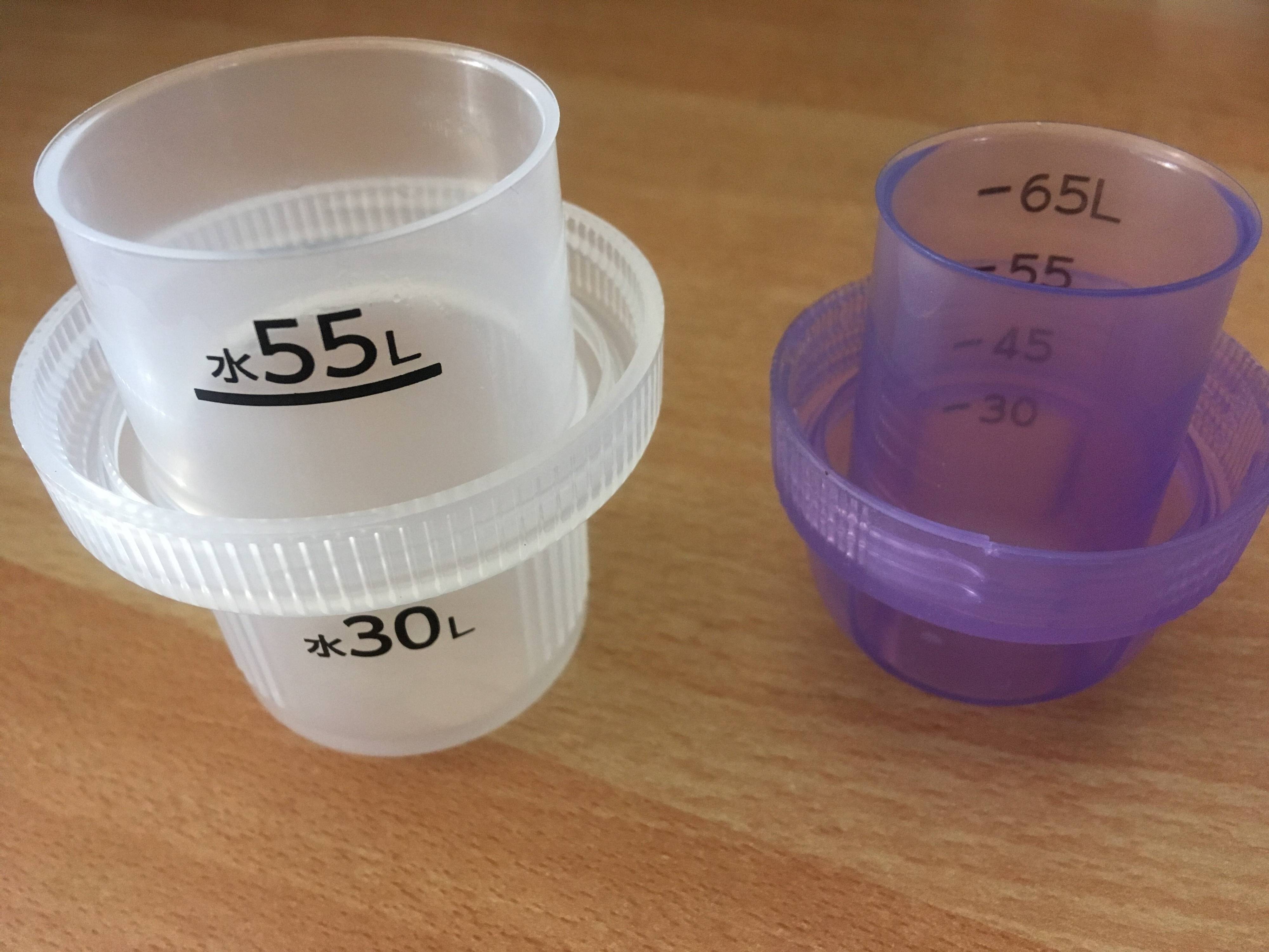上の写真の2つのキャップの場合、左側の大きいキャップのほうの液体洗剤は、水量30lあたりの使用量の目安は、「キャップ1/4」で25ml、一方、右側の小さいキャップのほうは、水量30lあたりの使用量の目安は、「キャップ1/4」で10ml。