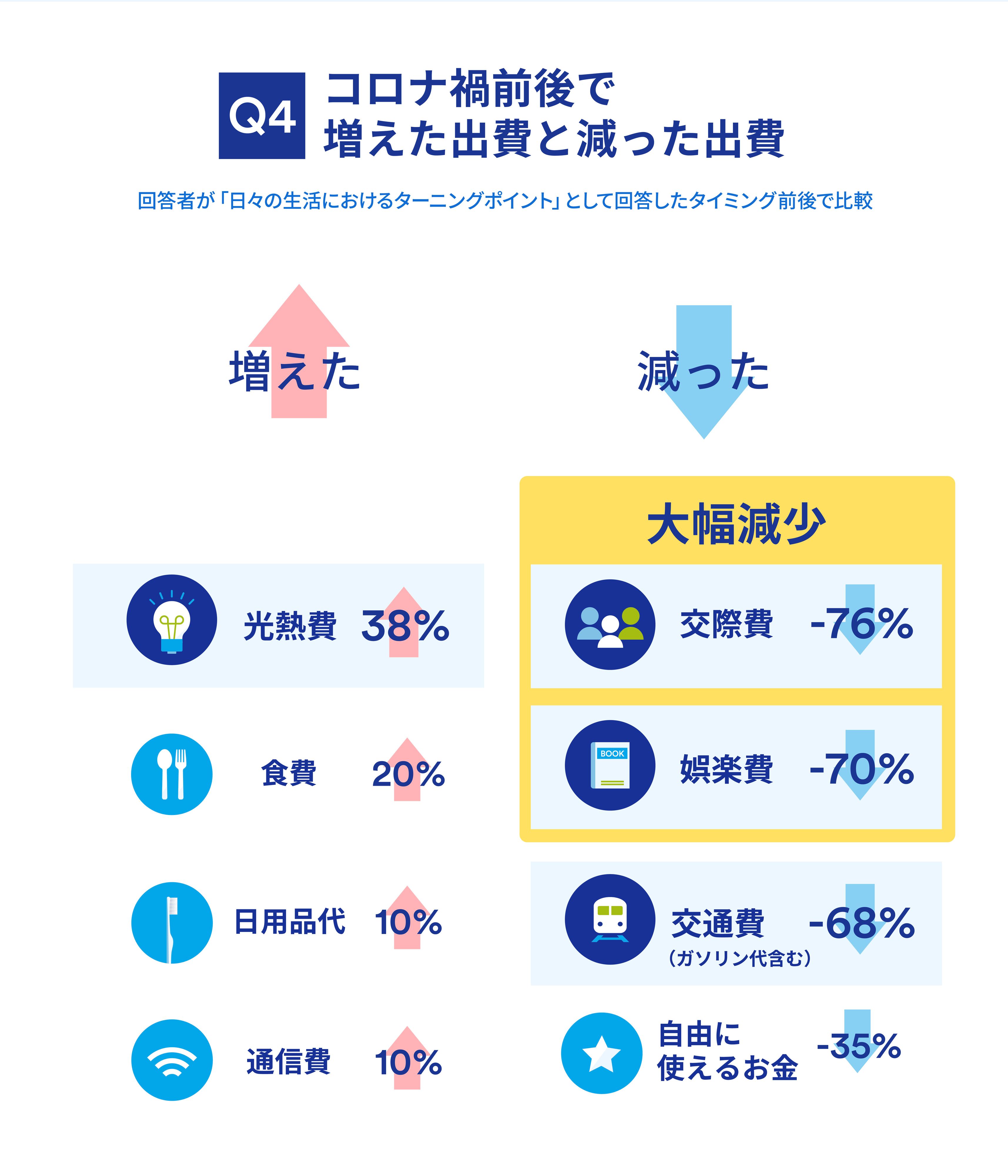 また、「自由に使えるお金」が減ったと回答している人も35%いました。新型コロナウイルスの影響で収入が減ったり仕事そのものがなくなった人が増えている状況の中、今後に対する不安から出費を控える方が多いのかもしれません。