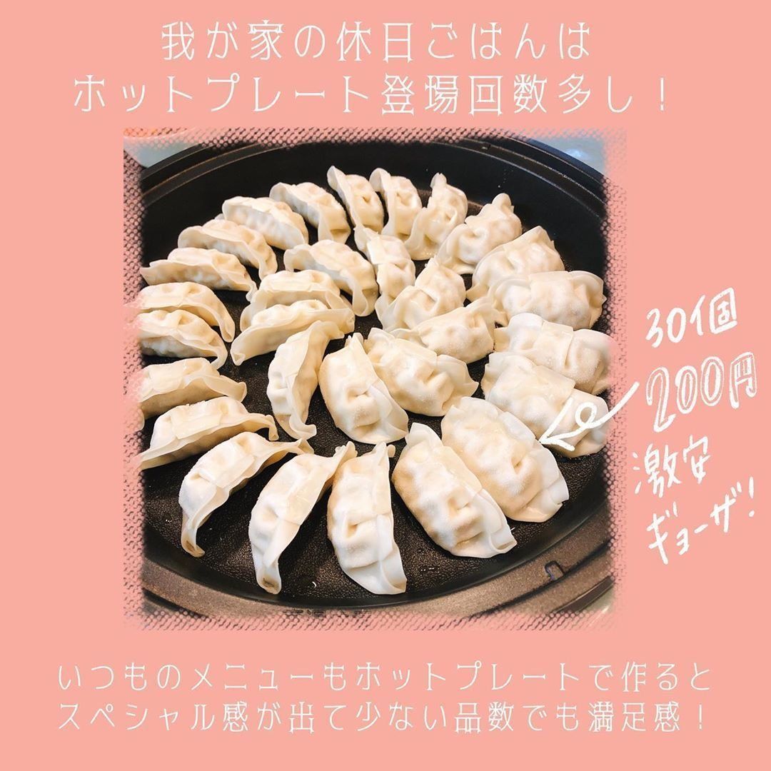 また、mayu.kakei_28さんは休日のごはんにホットプレートを活用しています。30個200円の激安餃子も、ホットプレートをつかって焼くことでスペシャル感がでて、少ない品数でも満足感を感じられるのだそう。