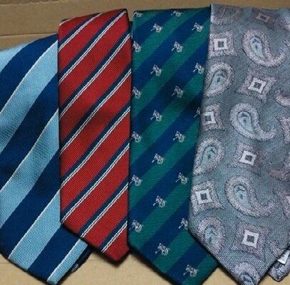 「古い物をどう生かすか考えるのも楽しいんです」。例えば、4本500円で購入したネクタイを、長男のセレモニー用蝶ネクタイにアレンジ。ネクタイを開いて生地にすれば、いろいろ使い回しできます。