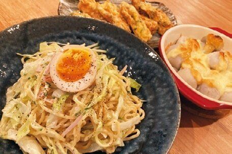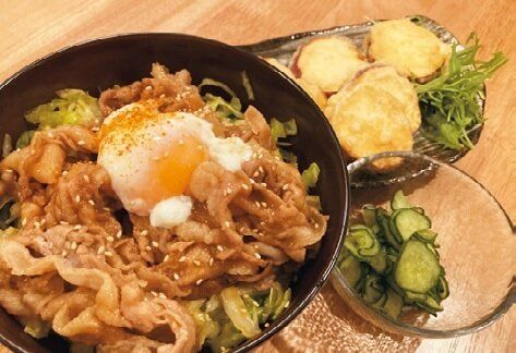 豚丼は刻んだキャベツとトッピングの温泉卵で彩りよく。さつまいもは天ぷらにして満足感アップ。