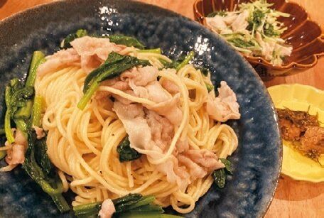残った豚肉とほうれん草、にんにくを使ったパスタがメイン。副菜は水菜と冷凍庫にあったささ身の中華炒め。