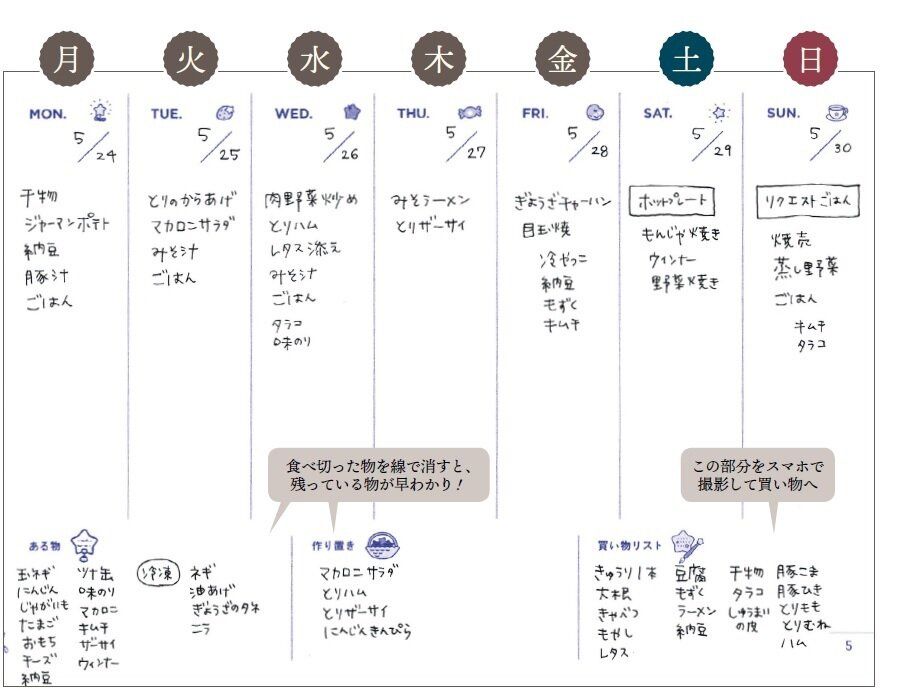 1週間の献立が決まると、必要な食材の種類や量が明確に。不要な物を買ったり、買いすぎたりするのを防げるから、買い物を必要最小限にできます!