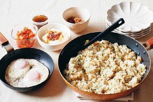 先週残って冷凍しておいた餃子のたねを使い、餃子味の炒飯に。副菜は各自が好きな物を選ぶスタイルに。