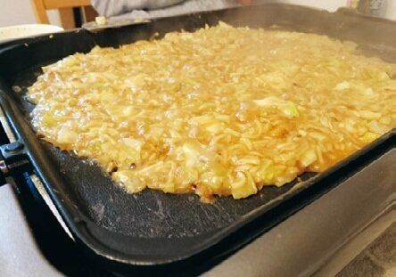 もんじゃの具に、少しずつ残っている食材を刻んで投入。ホットプレートでダイナミックに楽しみます♪