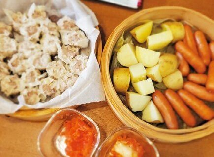 シュウマイやじゃがいもをせいろ蒸し。シュウマイは多めに作って余りを冷凍し、翌週のお助けおかずに。