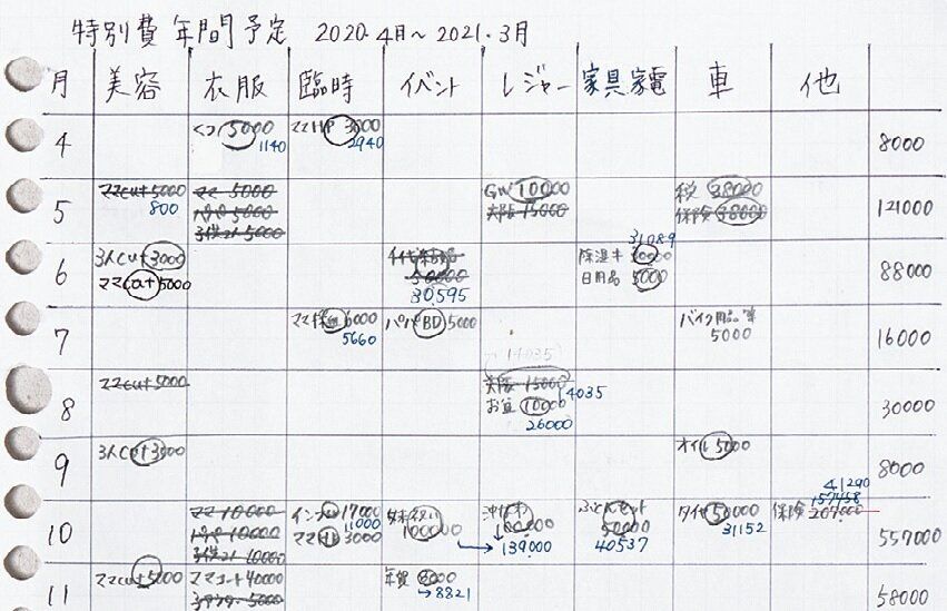 年度末の3月に、特別出費の予定一覧表を作成。「この月は特別出費が多いから、貯蓄できるのはこれくらいと予測できるので、月貯蓄額に変動があっても焦らずにすみます」。