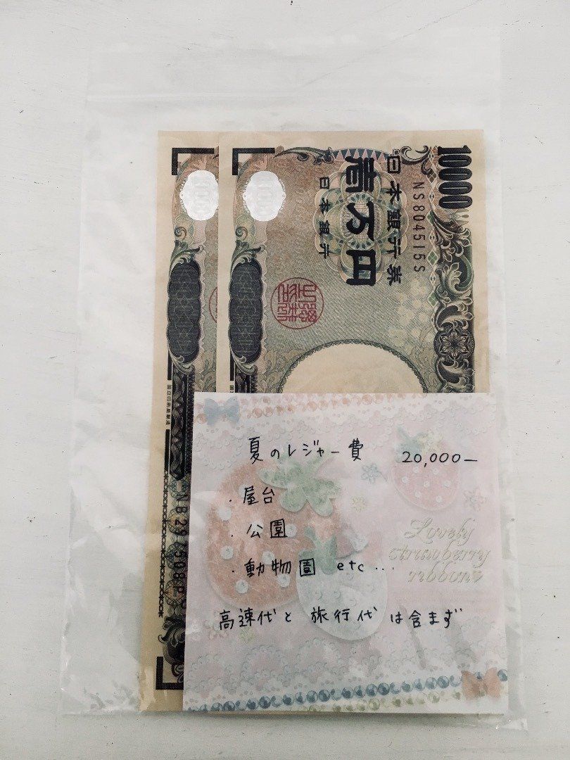 ここゆきさんは、夏休み中の予算崩壊を防ぐために、レジャー専用のお金を見えるかたちで管理するようにしました。お出かけやレジャーにかかる費用をボーナスから2万円取り分け、普段の生活で使うお金と別々に管理。屋台や自販機などレシートのない出費にも対応できて、残金がひと目でわかるので、使い過ぎの防止にもなるそうです。