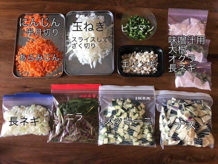サンキュ!STYLEライターマツさんは、買いものに行く回数を減らすべく、1週間の献立を決めてから買い出しし、食材を冷凍保存しているようです。食材は買ってきたその日に刻み、袋に小分けして使う日まで冷凍保存。こうすることで食品ロスも防ぎ、買いものの回数が減ることとでムダ買いも予防しているようですね。