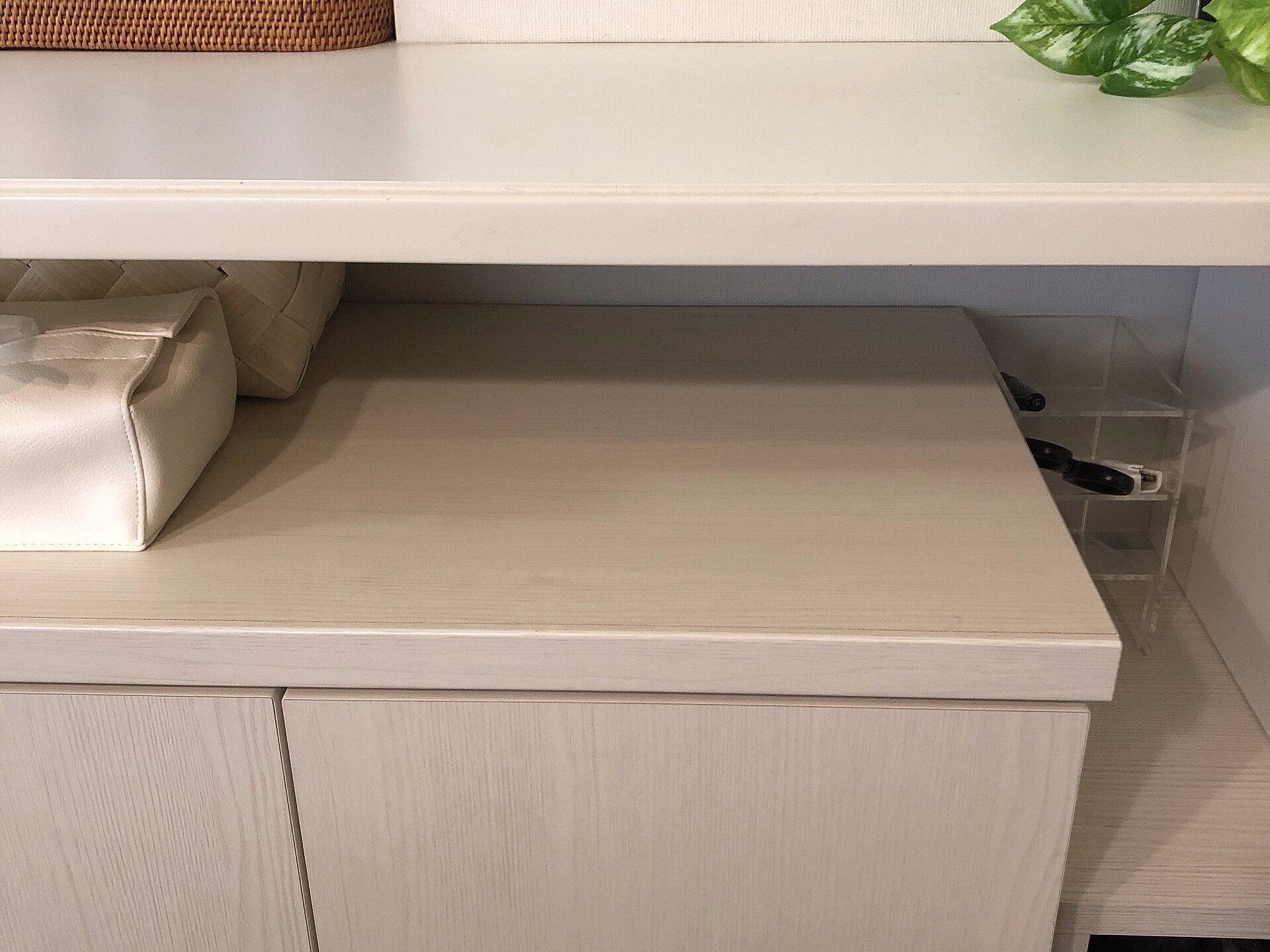 わが家ではカウンター下のキャビネットを私のスペースとして、中にパソコンや本、文房具の定位置があります。パッと置ける一時置き場としてキャビネットとカウンターの間のスペースをあけています。
