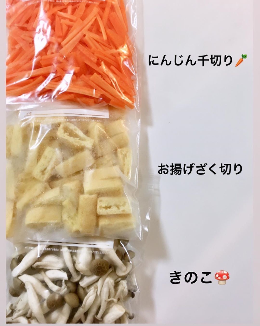 さらに節約したければ自家製の冷凍食品をつくってみては?ニンジンやお揚げ、きのこなどをカットした状態で冷凍しておけば、みそ汁などにパパっと使えて重宝しますよ。
