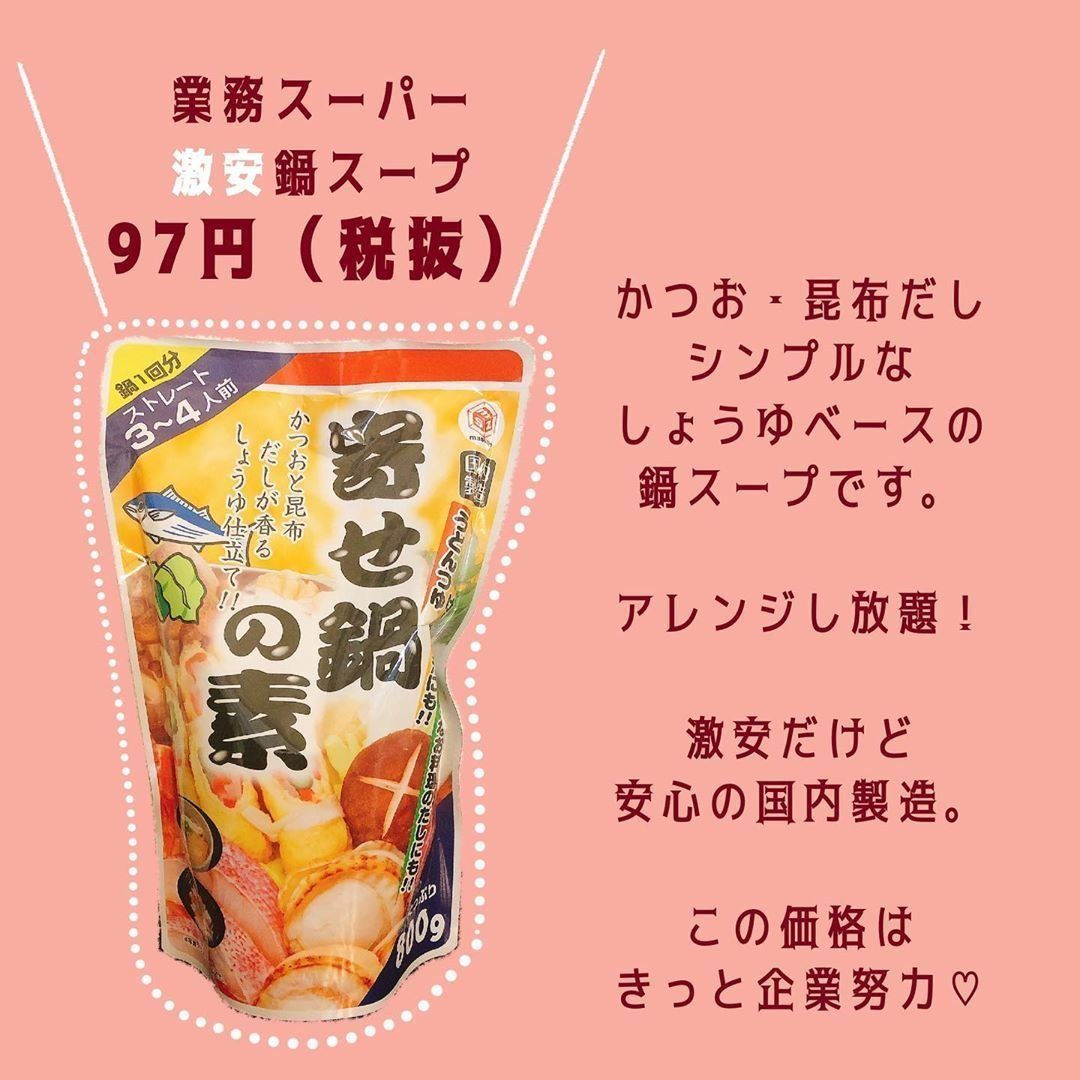 ふだんから業務スーパーやコストコを駆使し、節約にはげんでいるmayu.kakei_28さんのおすすめは、鍋スープの素。スーパーで購入すると300円前後するものが、業務スーパーではなんと97円!業務スーパーで買った食材とあわせてお鍋を楽しんだそうです。激安価格ながら国内製造な点もうれしいポイントなんだとか。