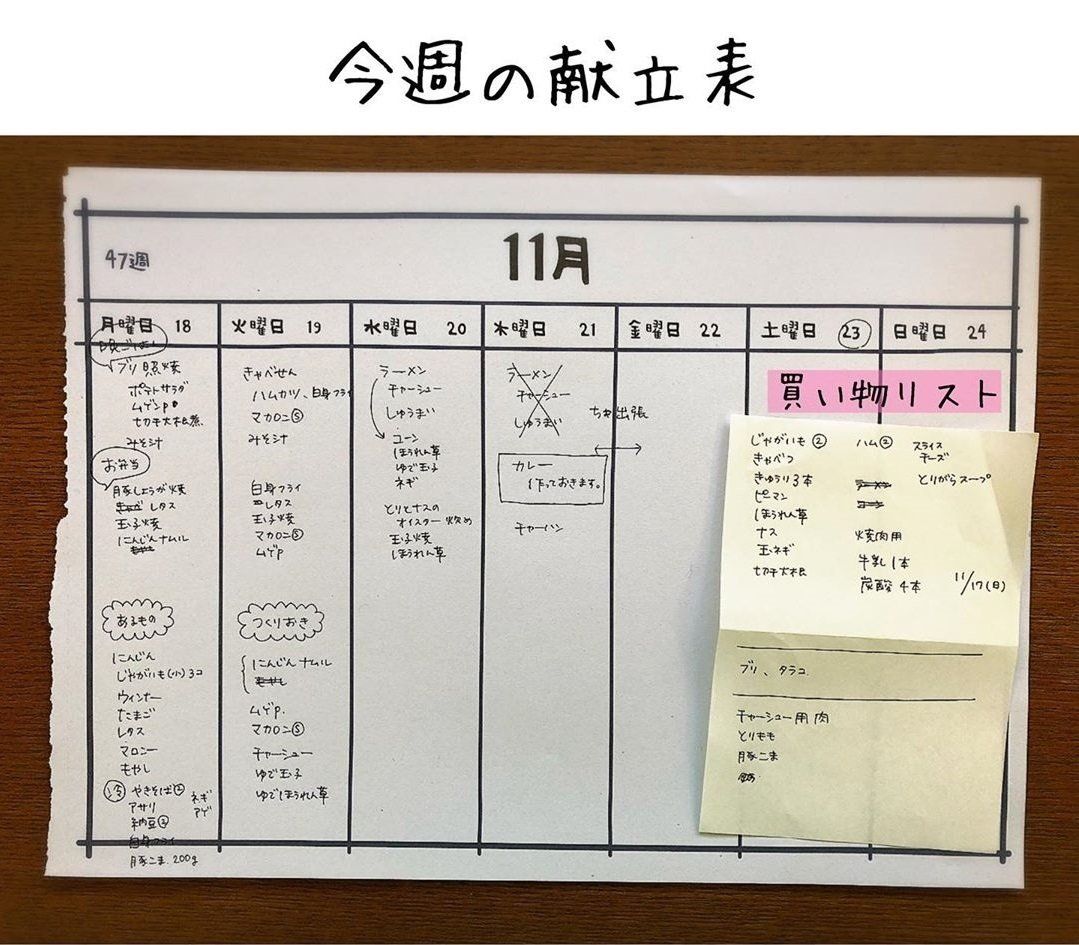 週の食費を1万円以下に収めているmegum.nakanoさんの食費節約術は、1週間分の献立を立ててから、買い出しやごはんづくりをすること。献立から買いものリストを作成するのでムダ買いの防止になるだけでなく、食材もムダなく使い切れるそうです。常備菜づくりをいっしょにしておくと、週の前半は時間にも余裕が出るそうですよ。